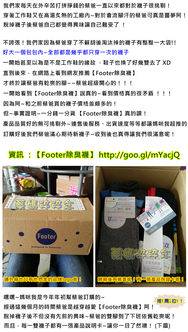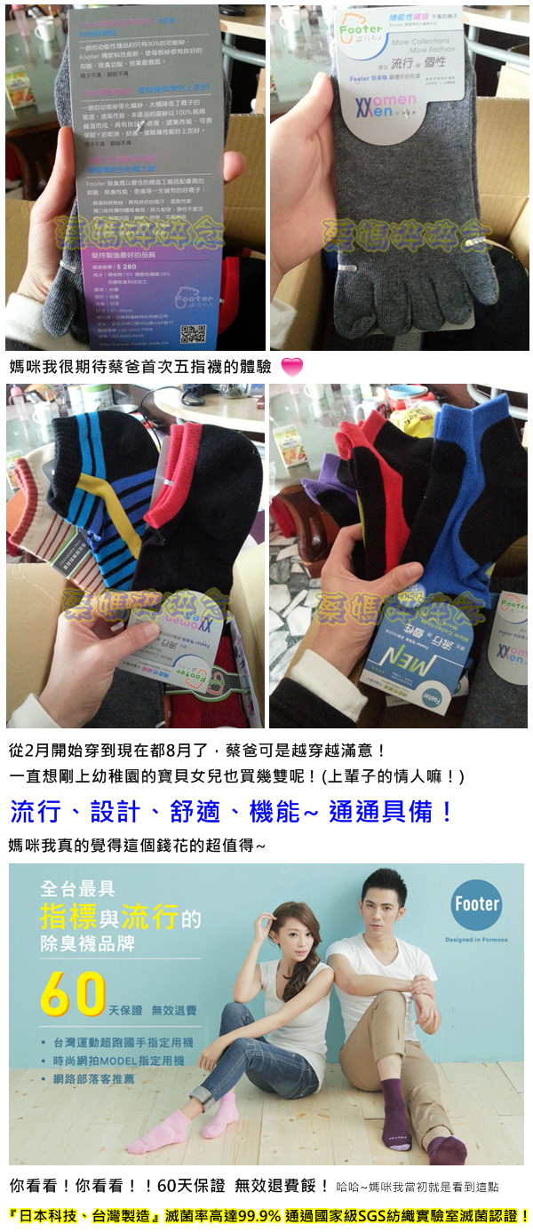 襪子小知識 : 『 五指襪 』五趾襪,襪子的一種,材質為棉質,在趾部有讓腳趾個別套上的設計,穿上後每根腳趾都是分開的。其優點是較易吸腳汗,比較不會腳臭,也比較衛生。
